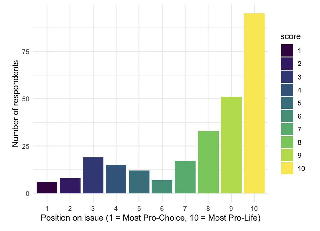The questionnaire asked participants to rate where they identify on the issue on a scale from 1 (most pro-choice) to 10 (most pro-life) and answer a variety of questions, such as “How can we affirm the image of God in all persons involved?” and “Has the overturning of Roe v. Wade made the issue more or less complicated for you?” Given the philosophical and practical nuances of abortion, we were focused on using qualitative data to identify some of the complexities of students’ views. Thus, most of the survey’s questions were free-answer.